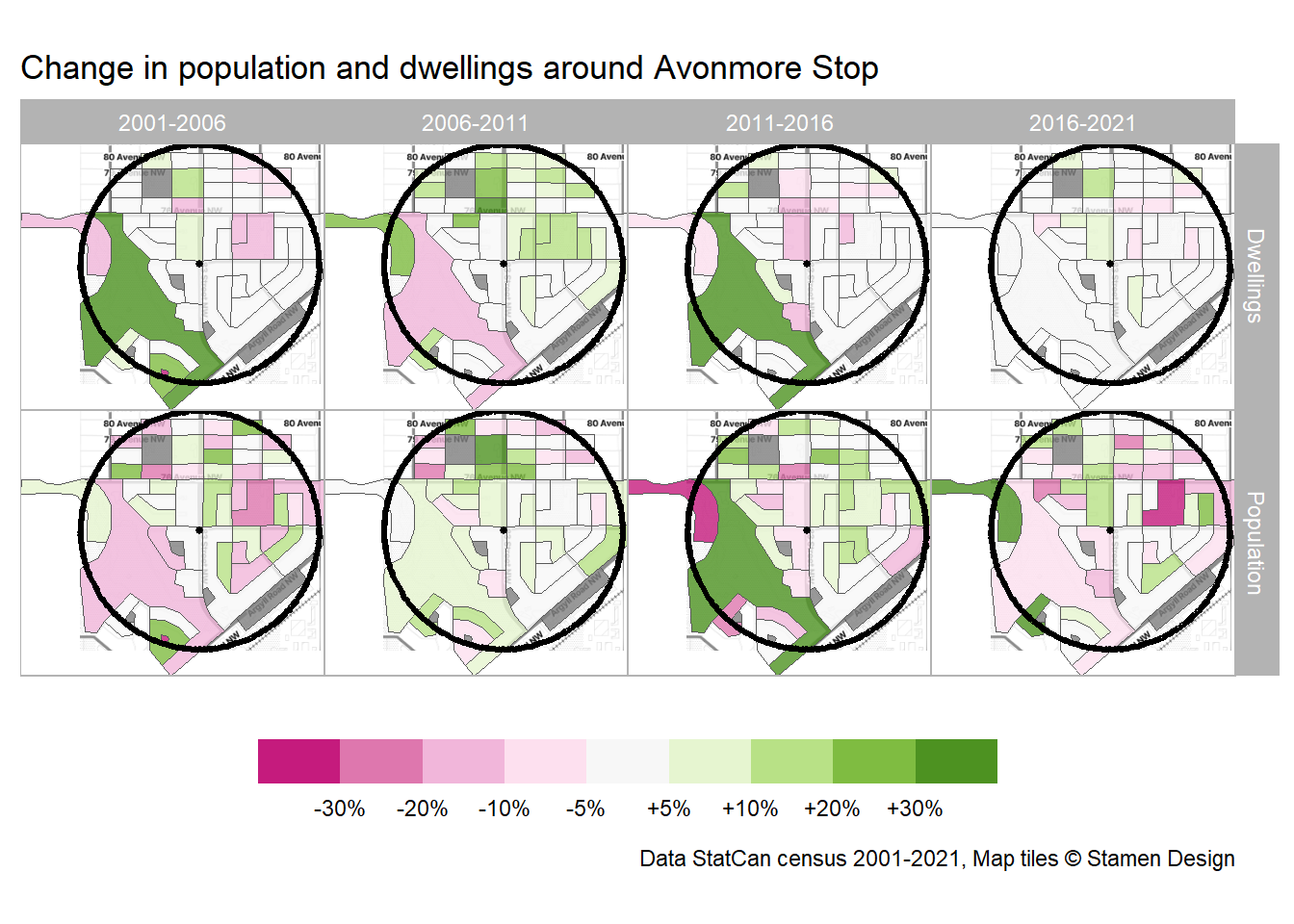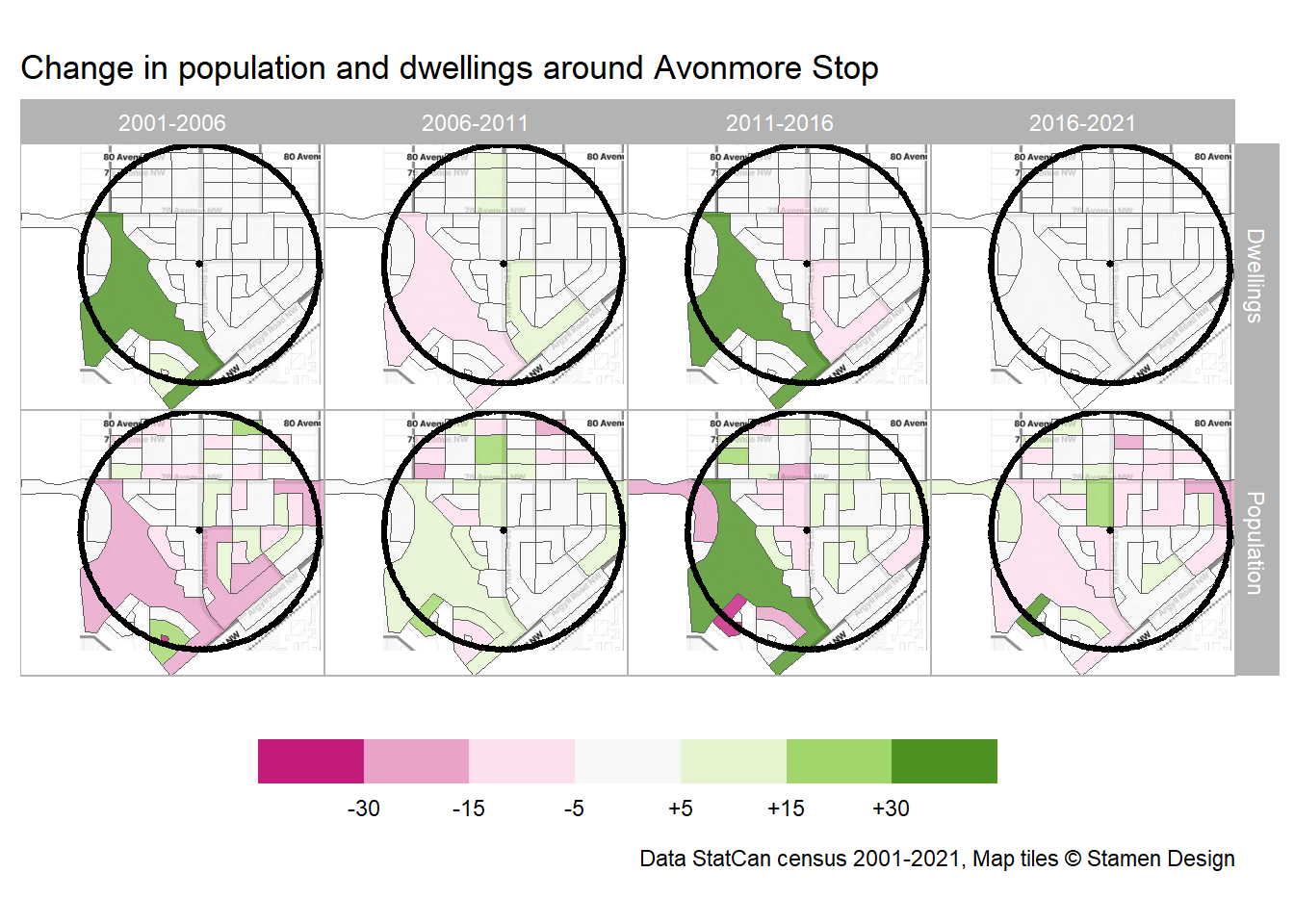 Since we have data from multiple censuses, we can also track change census-over-census, every five years from 2001 in Figure 7. Like McKernan/Belgravia, Avonmore remained relatively static in every census period.