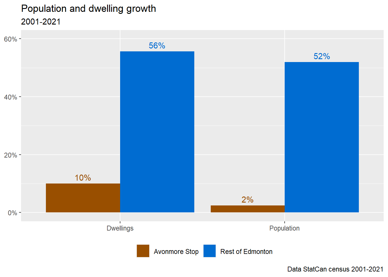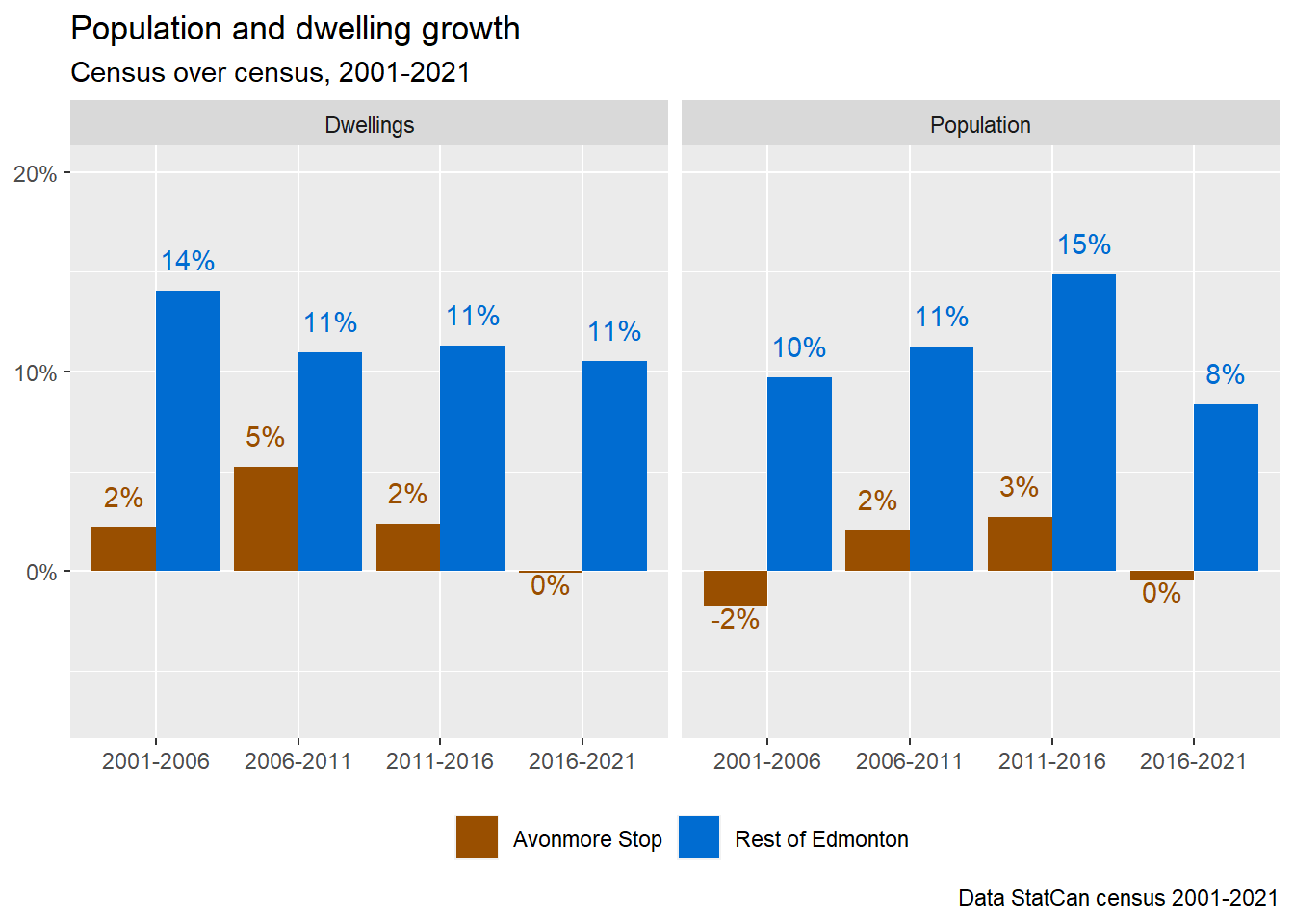Now that the census station area is well-defined, we can divide Edmonton into the Avonmore Stop area and the Rest of Edmonton. As shown in Figure 4, neither dwellings nor population has grown significantly over the past two decades.
