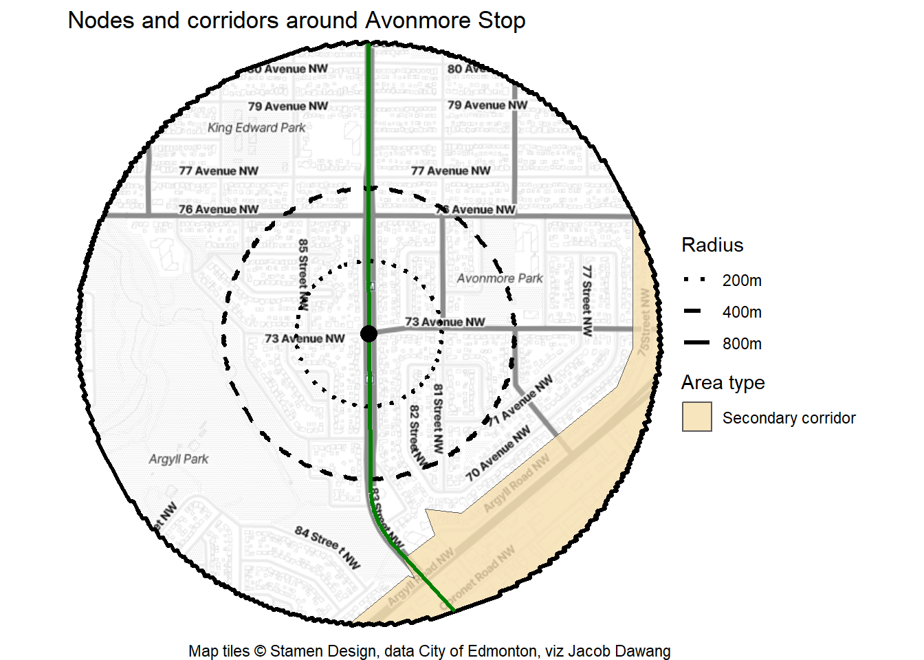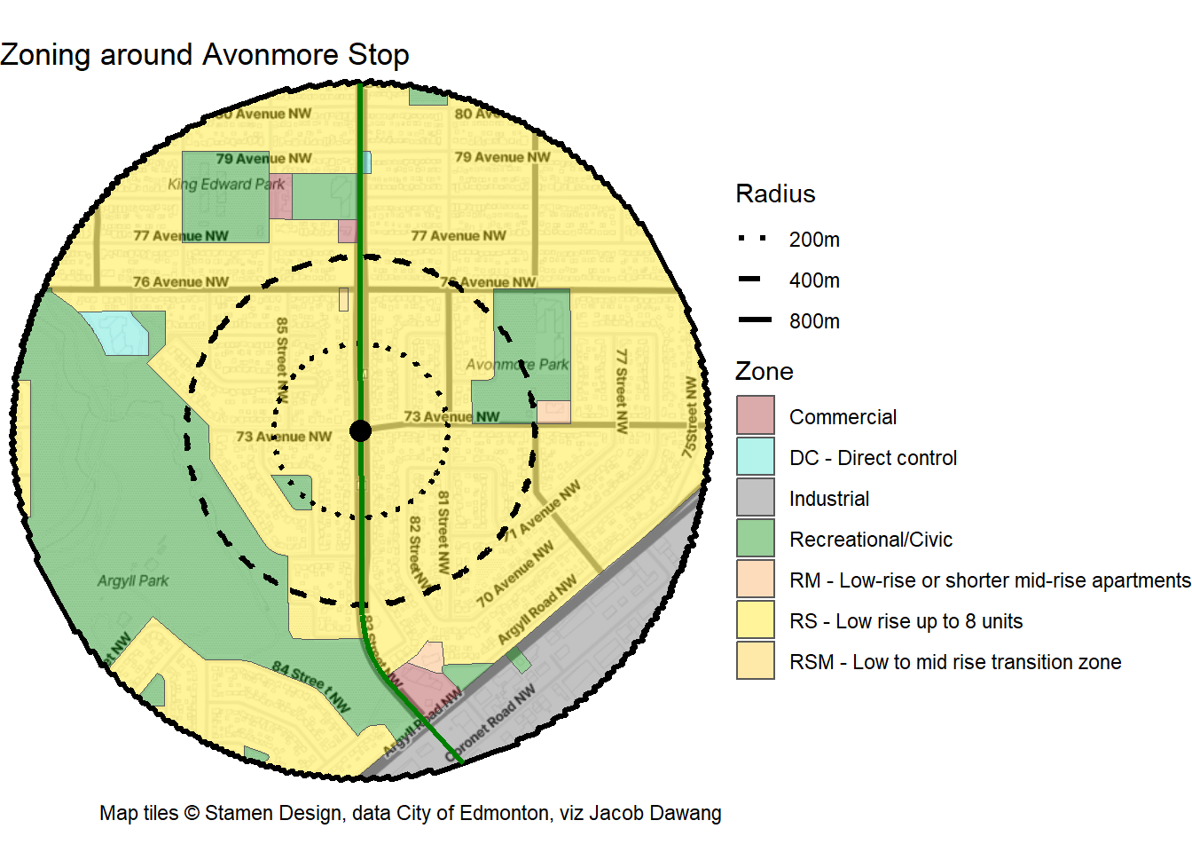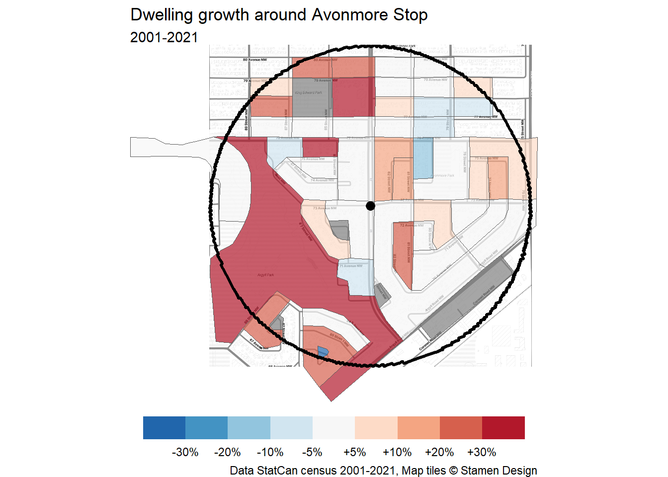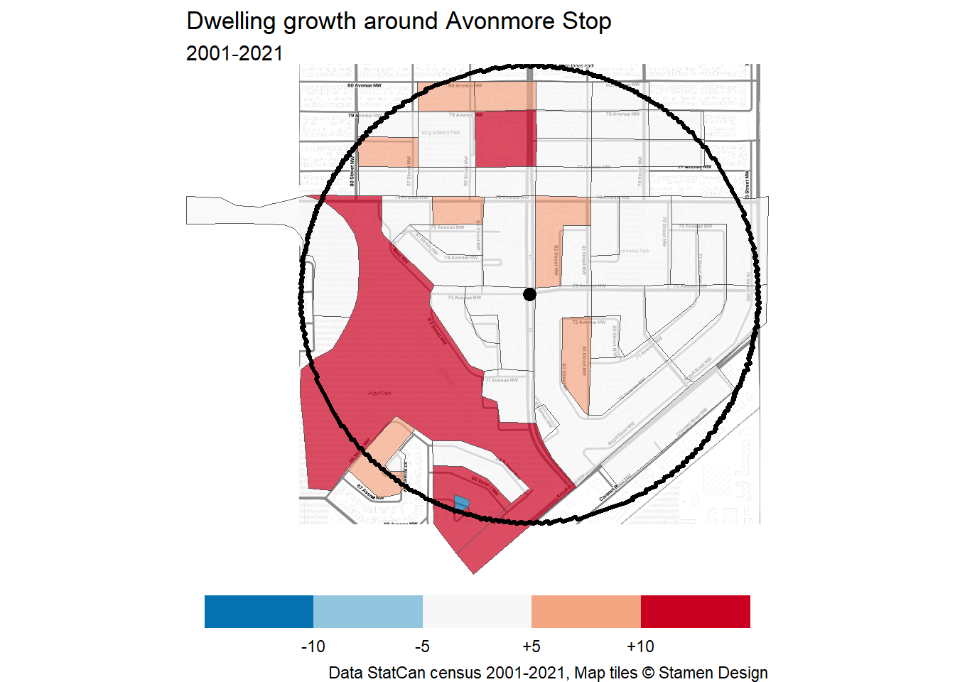 Let’s take a look at how the area around Avonmore Stop area has grown – or not – over the past 20 years. To start off, I’ve defined the station area as extending 800m from the platforms on 83 St at 73 Ave. This aligns with the largest radius of BC’s new TOD policy and is generally a 10-15 minute walk away.