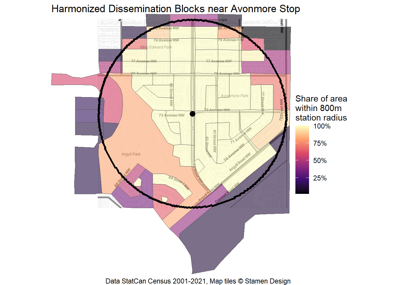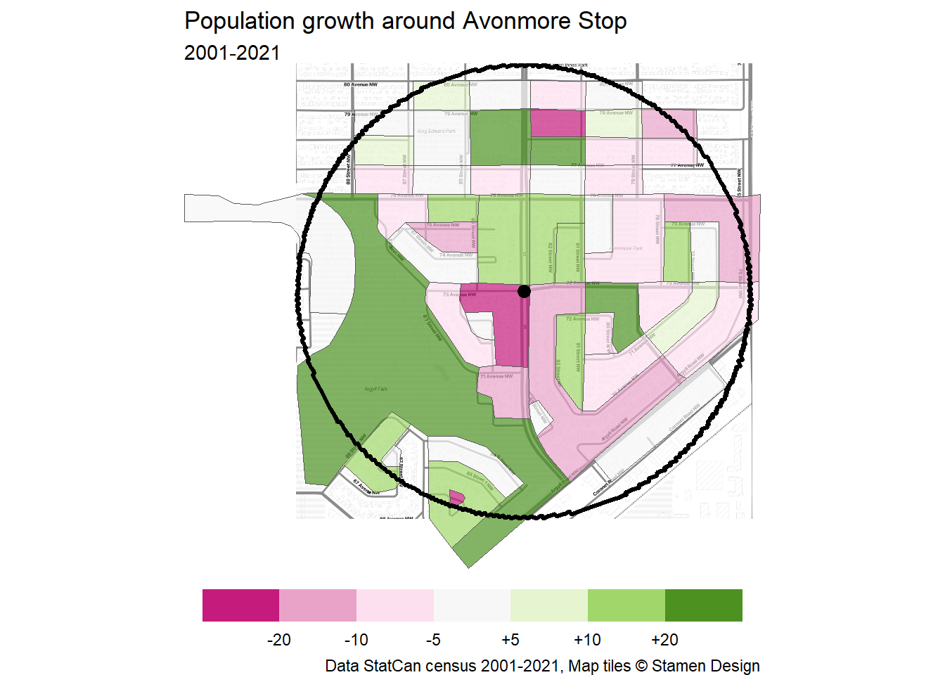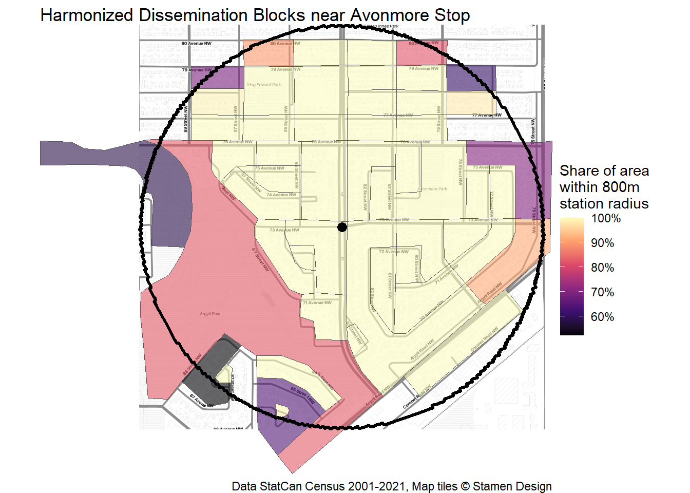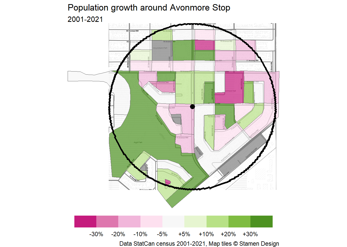 Let’s take a look at how the area around Avonmore Stop area has grown – or not – over the past 20 years. To start off, I’ve defined the station area as extending 800m from the platforms on 83 St at 73 Ave. This aligns with the largest radius of BC’s new TOD policy and is generally a 10-15 minute walk away.
