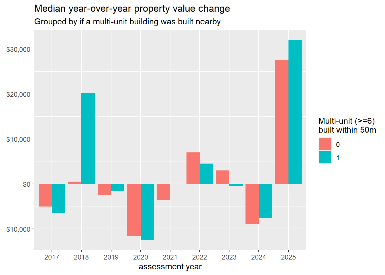 Figure 2: Median year-over-year absolute property value change grouped by if a multi-unit building was built nearby