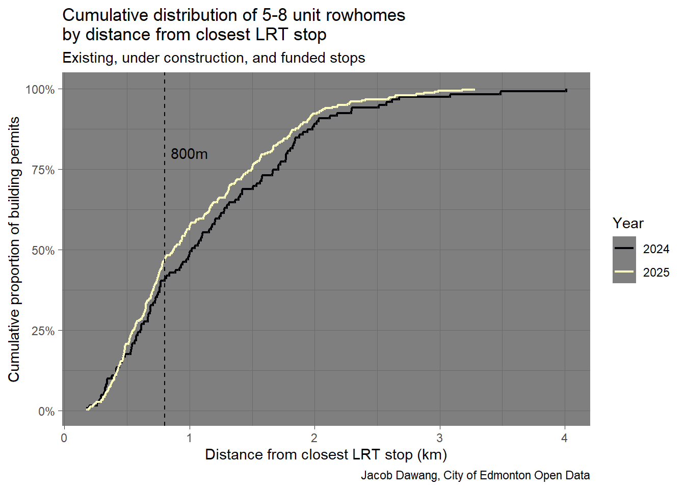 Figure 6 confirms around 50% of 5-8 unit rowhomes permitted in 2025 were within 800m of an LRT stop. 2025 is even an improvement over 2024, with the distribution bowed out and to the left.