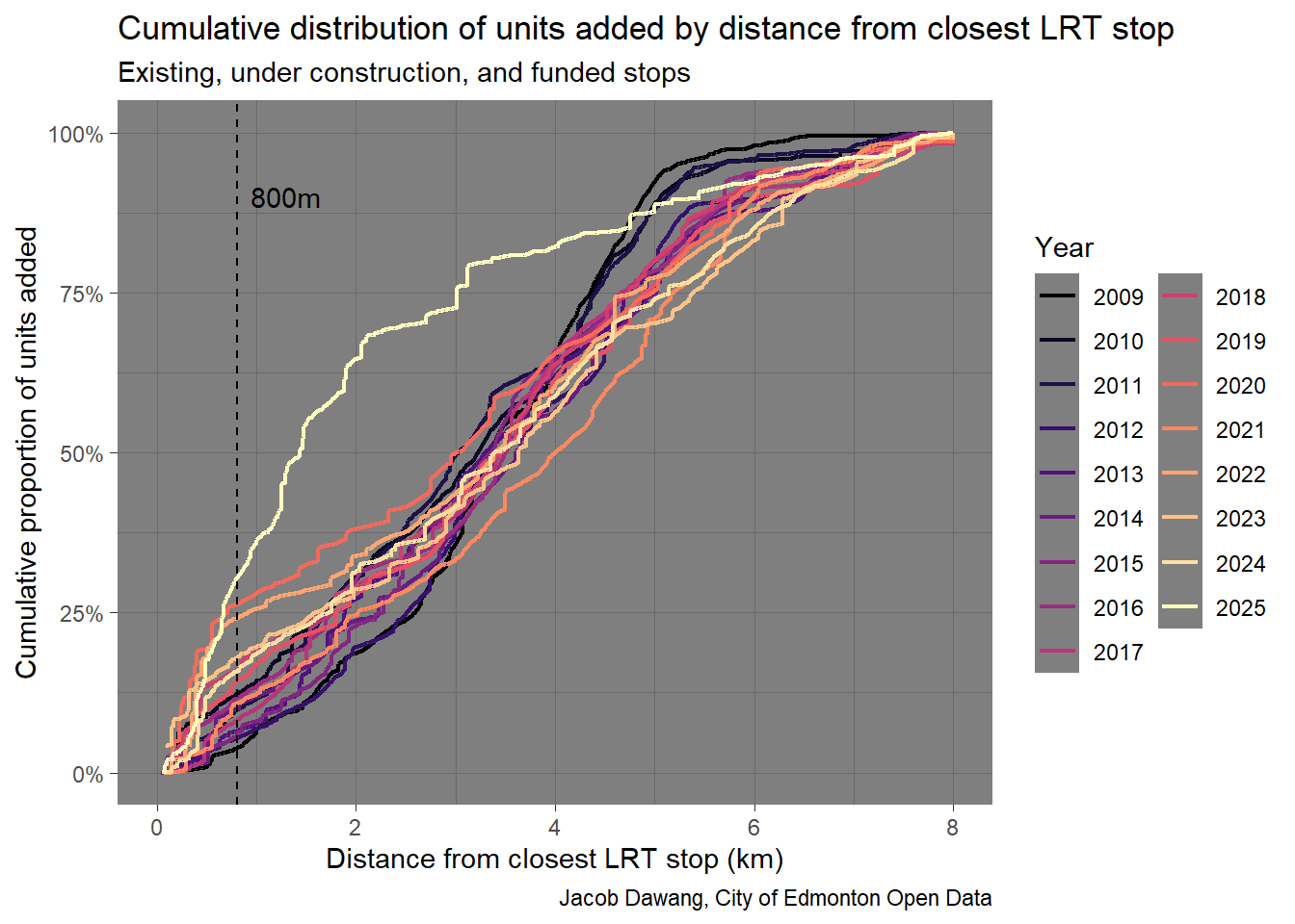 Besides the direct effect on housing supply and affordability, Edmonton’s zoning changes have enabled more people than ever to live close to transit. That means less people driving, less congestion, and less greenhouse gas emissions. In 2025, more homes were permitted close to transit than ever before. Figure 4, shows just how differentiated 2025 is. Besides permitting 30% of homes within 800m of transit, a record high for this threshold, the entire cumulative distribution is bowed up and to the left. That means we’re building substantially closer to transit than ever before. Even if people don’t live within walking distance, more people are going to have options that are a short bus ride or bike ride away.