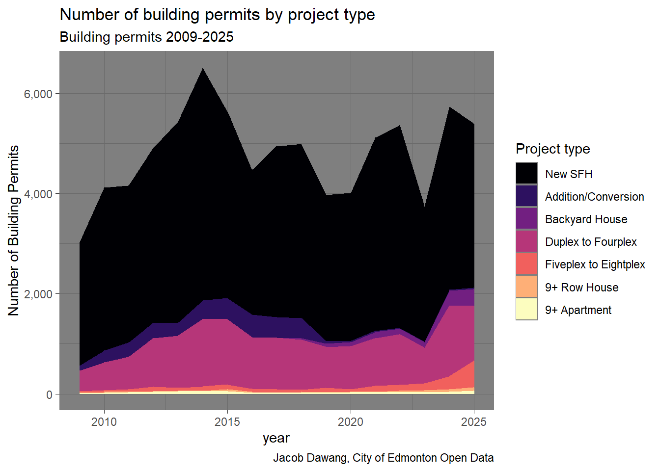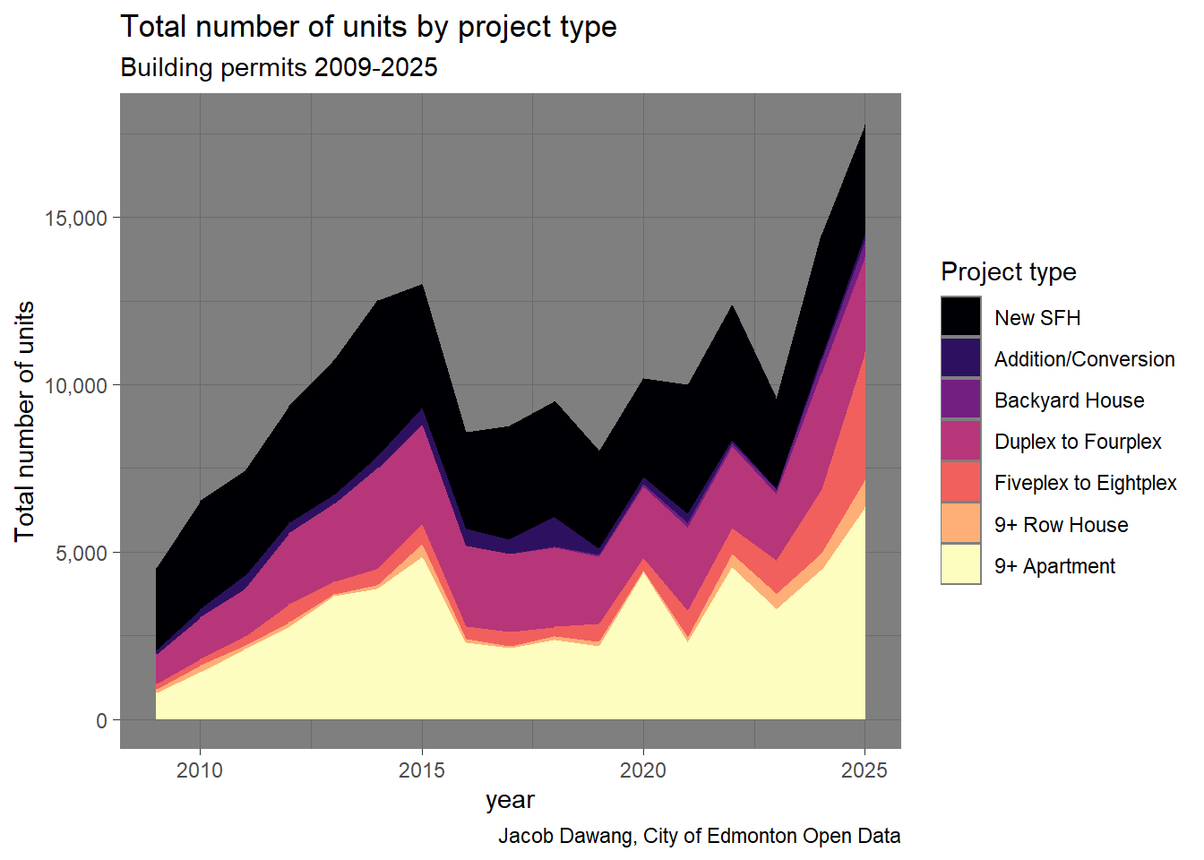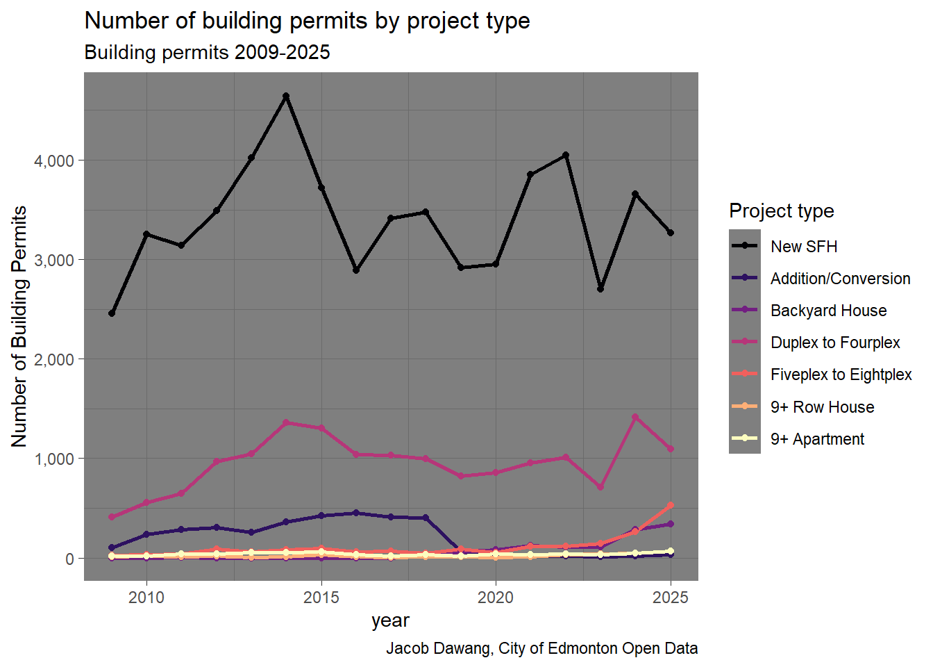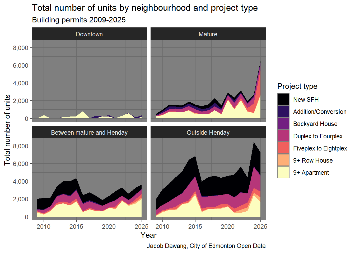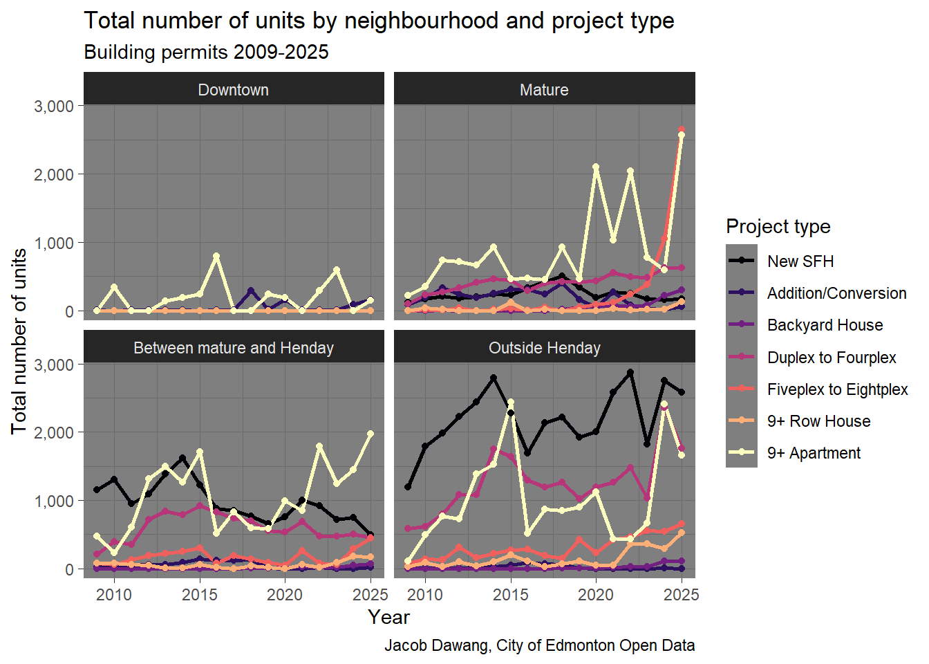 In Figure 3, we can see that 5-8 unit rowhomes and 9+ apartments drove the increase in homes in 2025. While 9+ apartments have historically reached the same scale as in 2025, the rise of 5-8 unit rowhomes is astounding. There is no other explanation except that Edmonton legalized 5-8 unit rowhomes in mature neighbourhoods at the exact right time, when demand was highest.
