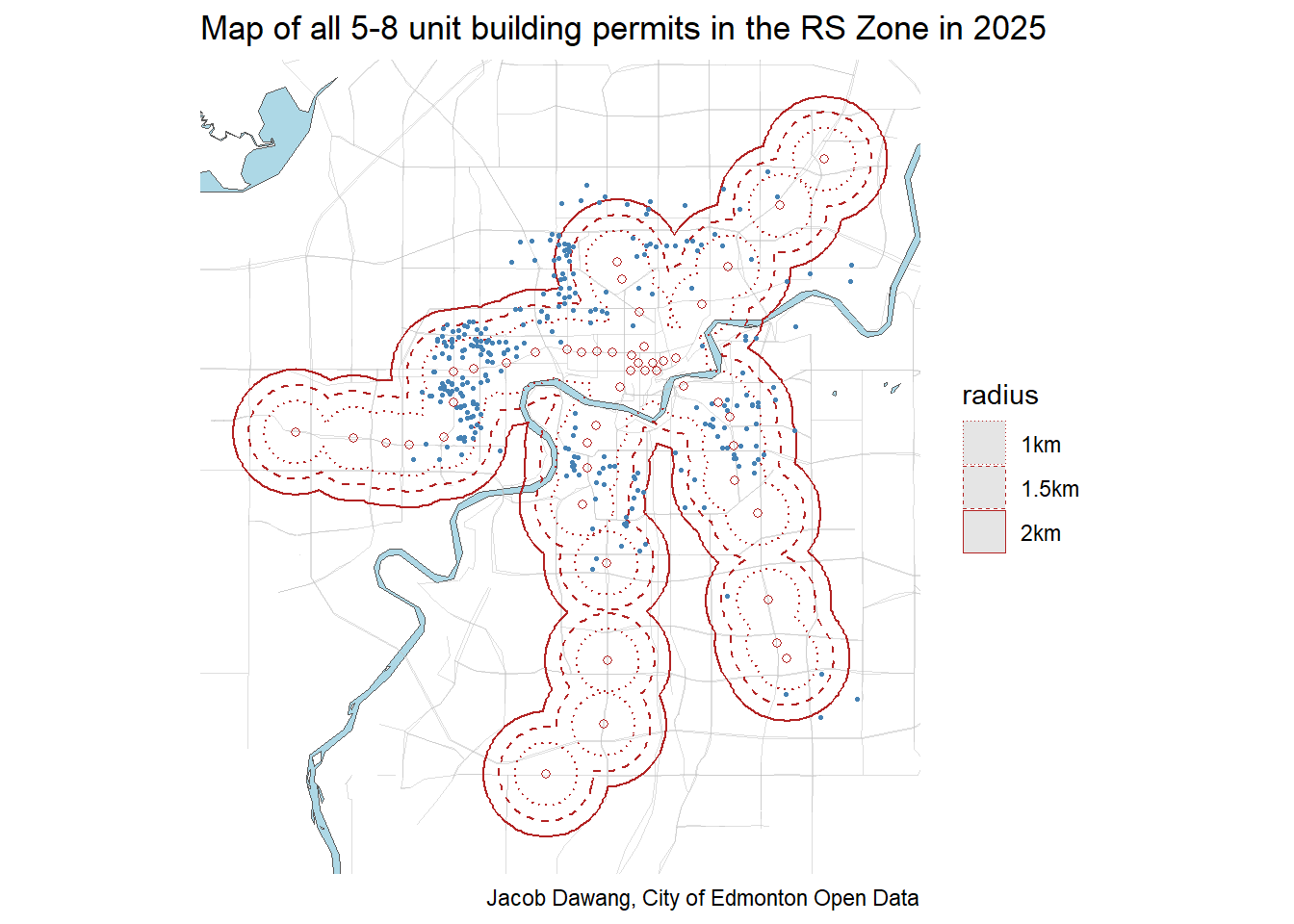 Once again, it is 5-8 unit rowhomes in the RS zone that is driving more homes to be built near transit. Breaking out a map in Figure 5, we can see that the 5-8 unit rowhomes follow the path of the LRT almost religiously, especially the Valley Line West.